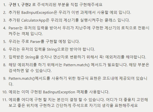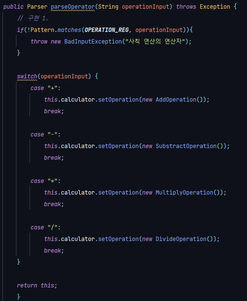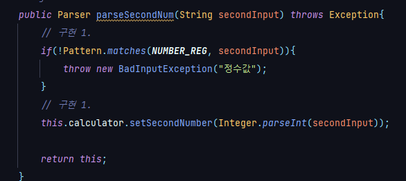 이 부분의 예외처리는 NUMBER_REG가 아닌 OPERATION_REG와 입력받은 사칙연산값을 비교하여 지정된 사칙연산이 들어오지 않으면 예외처리를 해주었다. 마찬가지로 BadInputException에 사칙 연산의 연산자라는 값을 넘겨주어 기존 문자열과 이 값이 합쳐져서 사용자에게 출력될 것이다.