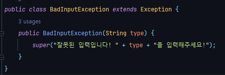 먼저 BadInputException.java를 확인해 보았다. 예외처리가 되어있었고, 예외상황발생 시 작성된 문자열과 함께 type까지 받아서 함께 출력해 주는 것을 확인하였다. 이 부분에서 숫자, 문자열 두경우가 생기겠다고 생각하고 시작하였다.