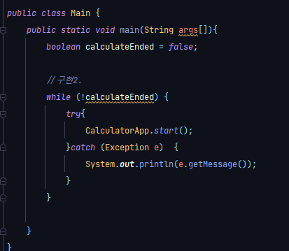 메인함수는 다음과같이 while문을 사용하여 calculateEnded가 true가 될 때까지 반복해 주었다.
