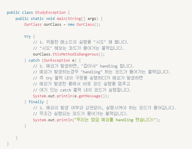 요약하면 try로 문제가 발생할 수 있는 위험코드를 실행한 후 catch에서 문제가 발생하면 잡아주는 역할을 한다고 생각하면 된다.