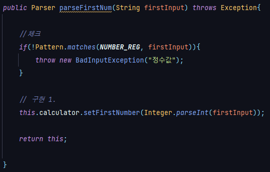 먼저 이 부분에 if문을 사용하여 사용자가 입력한 firstInput이 NUMBER_REG에 일치하는지 확인해 주는 구문을 작성하였다. 그 후 포함되지 않으면 예외처리를 사용하여 BadInputException에 정수값을 넘겨주고 아까 입력해 둔 문구를 출력하도록 하였다.
