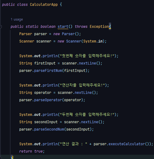 CalculatorApp.java를 확인해 보니 계산기를 실행하는 부분으로 확인됐고, 숫자와 연산자를 입력받아서 넘겨주는 것으로 생각되었다. 마지막에 true를 리턴해주는 것을 보니 true, false를 이용해서 입력받을 기간을 설정해야겠다고 생각됐다.
