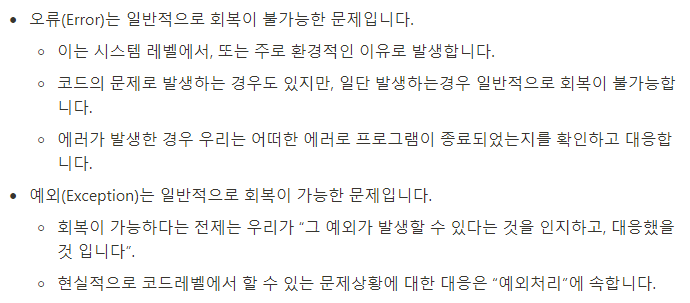 오류와 예외의 차이점이다.