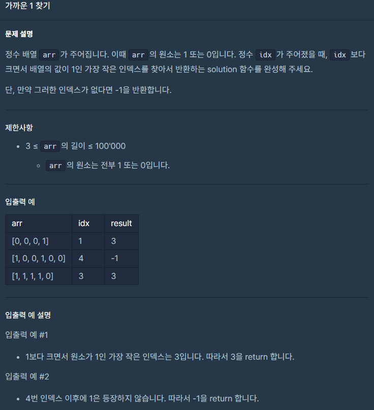 간단한 문제다. i는 idx부터 arr의 길이까지 반복시켜 줬고 arr [i]가 1이면 answer에 i값을 넣어줬다. 그 후 answer을 반환시켜 주고 종료했다.