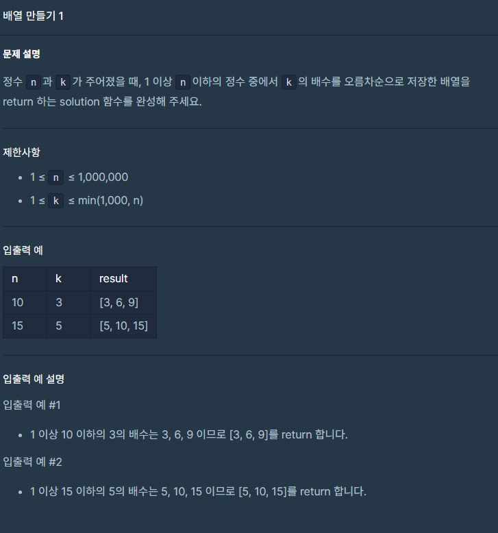 간단한 문제다. i를 k로 나눠서 나머지가 0이되면 answer에 추가했다. 그리고 반환해 주면 된다.