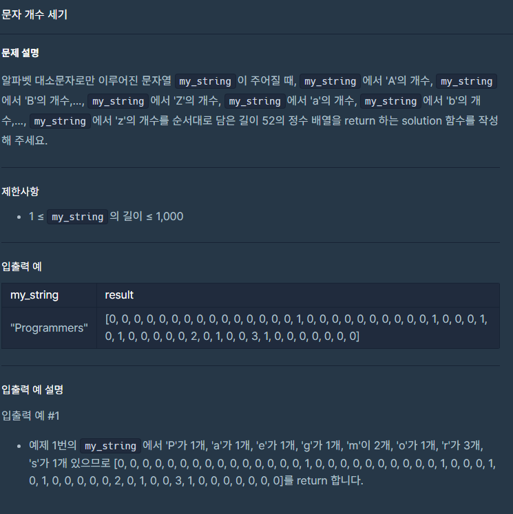 배열의 길이는 52개이므로 먼저 answer를 선언해줬다. 그 뒤 foreach문으로 문자열 my_string을 문자형으로 바꿔주고 하나씩 대입해 준다. ch가 대문자이면 answer [문자 - 'A']를 해준 포인트에 +1을 해주고 소문자라면 answer [ch - 'a'를 해준 뒤 소문자는 26번째 인덱스부터 시작하니 +26을 해주고 그 부분에 1을 증가시켰다. 그 뒤 answer을 반환하였다.
