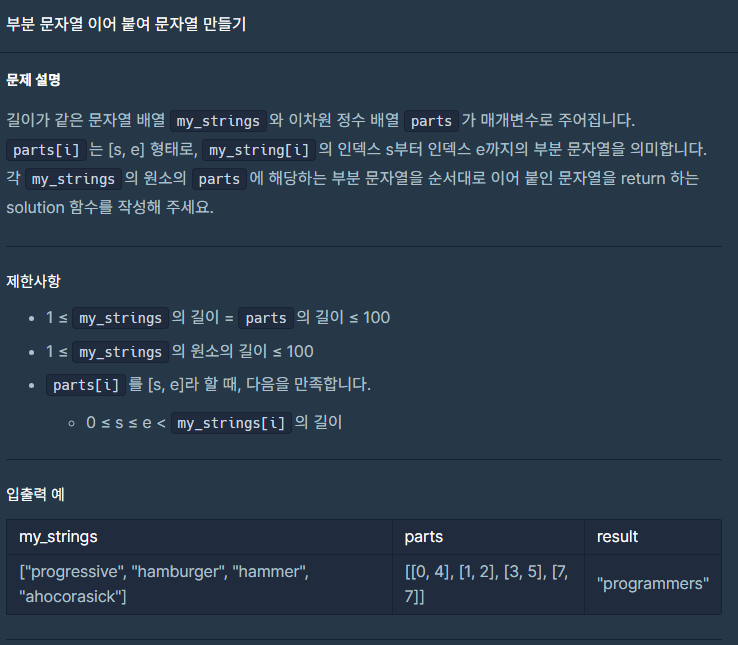 for문을 사용해서 my_strings의 길이만큼 반복시켰다. 그리고 parts [i][0], parts [i][1]의 값을 시작과 끝 값으로 a, b에 넣어줬다. 그 뒤 중첩 for문으로 a부터 b까지 반복하도록 하고 answer에 my_string의 i번째 원소의 j번째 원소를 차례대로 대입해 주고 answer을 반환하였다.