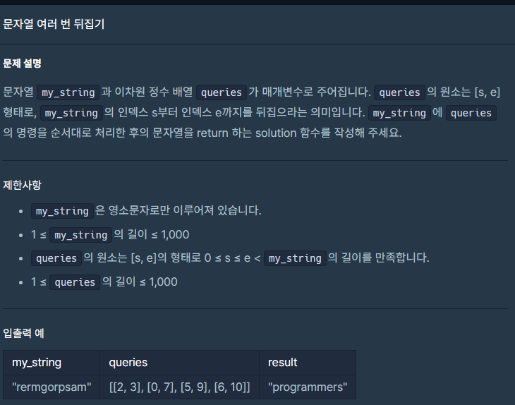 ch변수에 my_string을 문자형으로 대입했다. 그 뒤 for문을 통해서 queries의 길이만큼 반복시켜 주고 s, e에 범위를 대입해 줬다. while문을 사용해서 s가 e보다 작을 때 반복하도록 했고 s와 e의 자리를 바꿔주며 s는 ++ e는 --해줬다. 그 뒤 answer에 ch값을 집어넣어 주고 반환하였다.