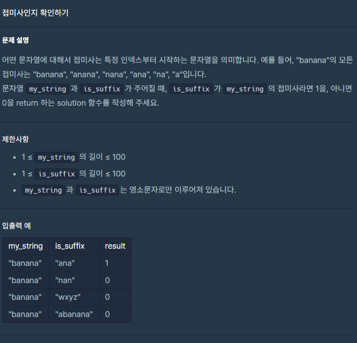 endsWith를 통해서 접미사인지 체크했다. 접미사라면 1을 반환하고 접미사가 아니라면 0을 반환했다.