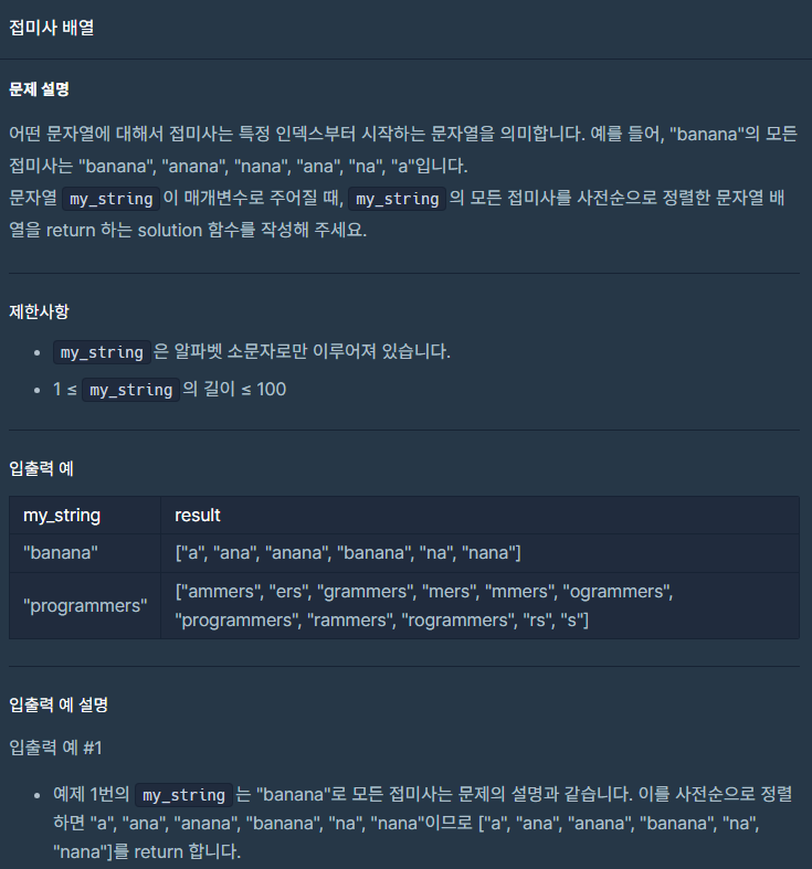 간단한 문제였다. my_string의 길이만큼 answer의 크기를 지정해 주고 for문을 사용해서 answer에 substring을 사용해서 모든 접미사를 넣어줬다. 그 뒤 Arrays.sort를 사용해서 오름차순 정렬을 해주고 반환하였다.
