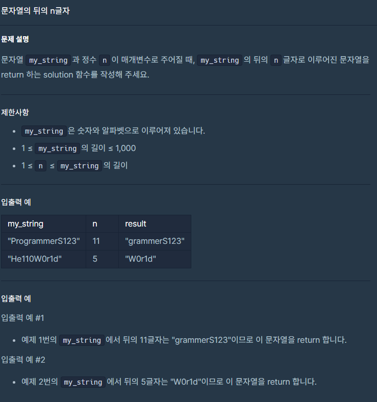 간단한 문제였다. 시작점은 my_string의 길이에서 n만큼 빼준값에서 시작해 주고 my_string의 길이만큼 반복해 줬다. answer에 값을 차례로 대입하고 반환해 주면 끝난다.