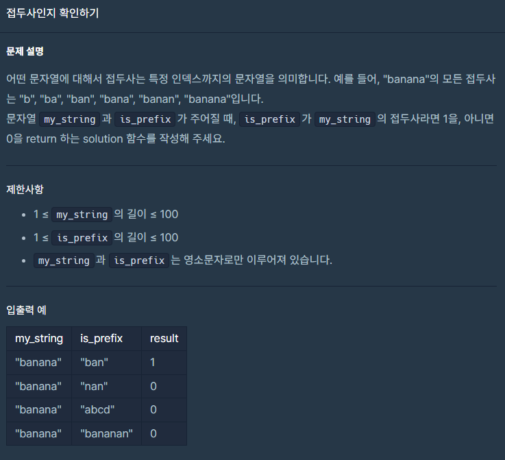 startsWith() 함수를 사용했다. startsWith() 함수는 문자열이 특정 문자열이나 접두사로 시작하는지 체크해 주는 함수이다. if에 넣어서 참이면 1을 반환하고 참이 아니라면 0을 반환해 줬다.