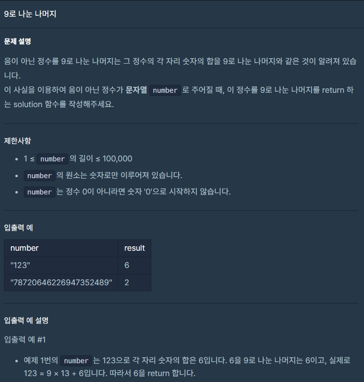 문제에 나온 대로 그대로 해줬다. 문자열 배열을 선언해 준 뒤 number의 값을 대입해 줬다. 그 뒤 result의 길이만큼 반복해 주고 sum에 각 원소들을 정수형으로 바꿔서 더해줬다. 그 뒤 sum을 9로 나눈 나머지값을 answer에 대입해 주고 반환하였다.
