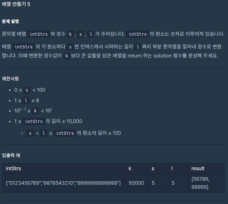 for문을 사용해서 intStrs의 길이만큼 반복해 줬다. 그 뒤 내부에서는 String형 변수하나를 만들고 intStrs [i] 번째를 substring을 사용해서 s번째부터 s+l이전까지 잘라서 대입해 줬다. 대입한 subStrs값을 정수형으로 변환한 뒤 num이 k보다 크면 list에 추가해 줬다. 그다음 list의 값을 answer에 대입해 주고 반환하였다.