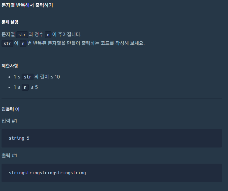 간단한 문제다. .repeat()를 사용해서 문자열 str를 n번만큼 반복해서 출력하였다.