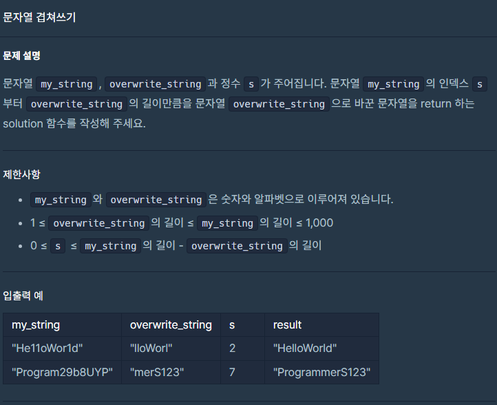 s번째까지의 my_string의 문자를 answer에 추가해 줬다. 그 뒤 overwrite_string의 문자열을 answer에 추가해 주고 만약 answer의 길이가 my_string의 길이보다 작다면 남은 길이만큼 my_string의 문자열로 채워주고 반환한다.