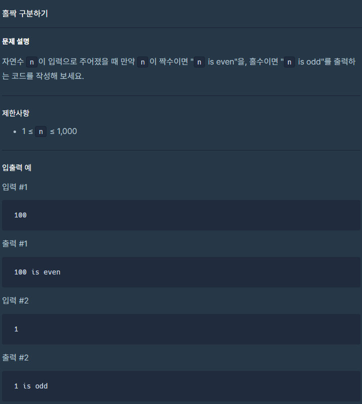 간단한 문제다. 짝수면 n is even, 홀수면 n is odd를 출력해 줬다.