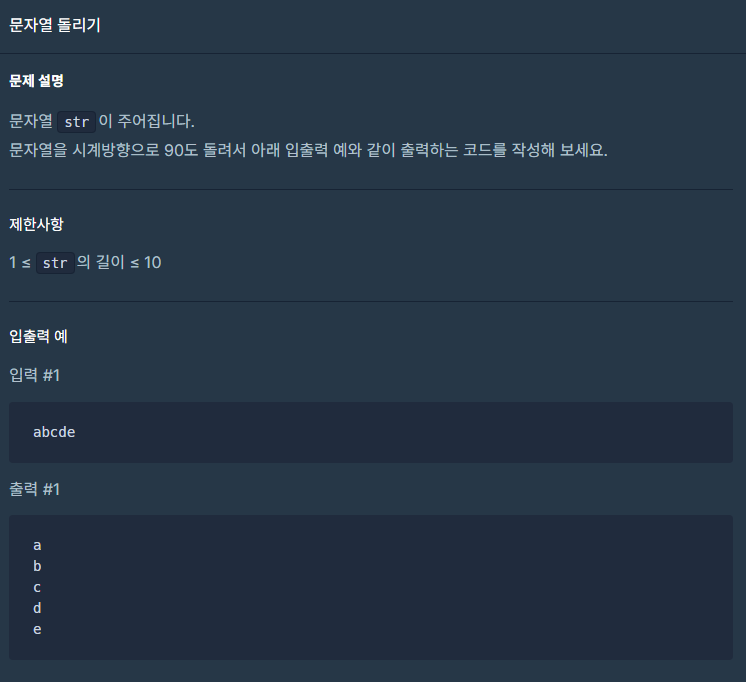 간단한 문제다. a의 문자열을 char형으로 하나씩 변경해서 출력해 줬다.
