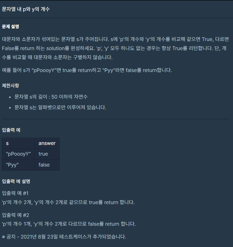 간단한 문제였다. for문 속에서 if문을 사용해서 p와 P일때는 p의 값을 증가시켰고, y와 Y일 때는 y의 값을 증가시켰다. for문이 끝난 뒤 if문을 사용해서 p와 y값을 비교해서 다르다면 answer에 false를 넣어주고, 아니라면 처음에 초기화했던 true가 그대로 반환될 것이다.