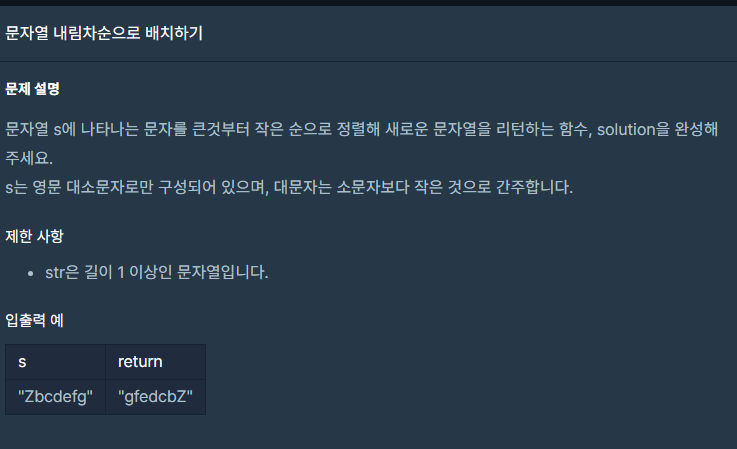 간단한 문제였다. 문자열 s를 char형으로 변환시켜 배열로 저장한 뒤 Arrays.sort를 사용해서 오름차순으로 정렬했다. 그 뒤 for문을 사용해서 문자열의 끝부터 처음까지 역순으로 answer에 저장해 주고 반환하였다.