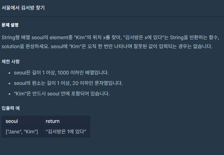 간단한 문제였다. for문으로 원소들과 비교를 해서 Kim과 같은 문자열이 있으면 변수 num에 i를 넣어주고 for문을 멈춘다. 그 뒤 answer에 "김서방은" + num + "에 있다"를 넣어주고 반환하였다.