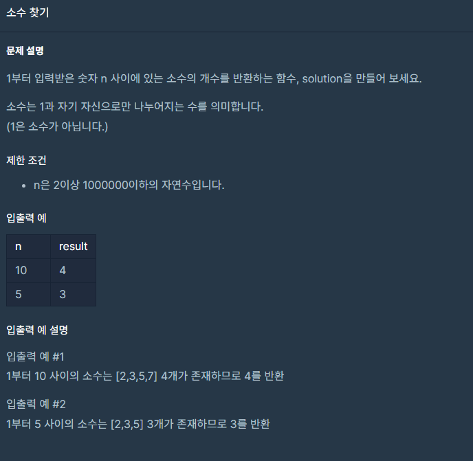 소수를 찾으면 되는 문제다. 중첩 for문을 사용해서 i는 2부터 n까지 반복해 주고 내부의 for문에서는 j는 2부터 j*j까지 반복해 줬다. j*j를 사용한 이유는 소수가 아니라면 그 수의 약수중 최솟값은 제곱근보다 작거나 같아야 하기 때문에 j를 i까지 돌리지 않고 j*j까지만 반복했다. 그 뒤 약수가 0개라면 answer에 1을 더해주고 answer을 반환했다.