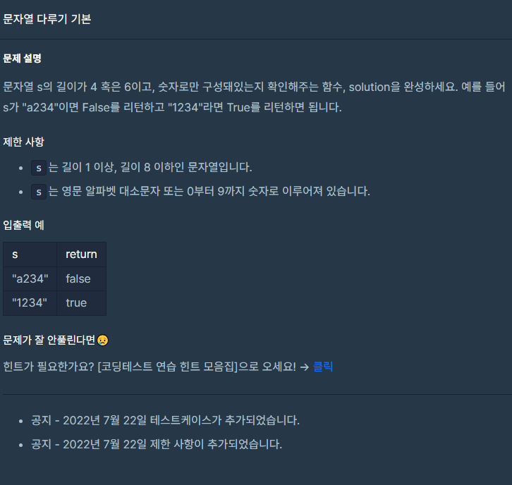 간단한 문제였다. s의 길이가 4나 6이 아니라면 answer를 false로 하였고, 숫자가 포함되어 있는지 체크하기 위해 for문을 사용해서 원소 하나하나를 비교해 줬다. a ~ A, z ~ Z가 들어간다면 false를 반환하였다.
