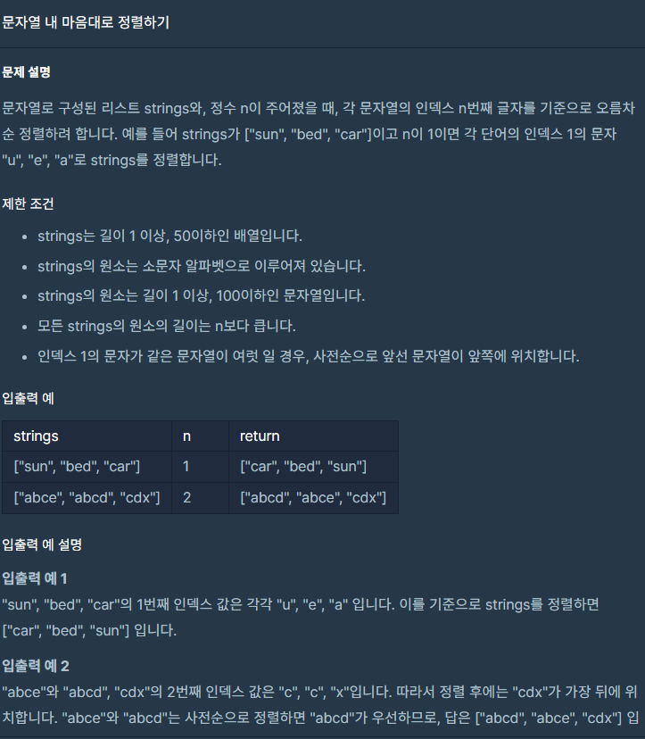 list를 하나 만들어줬다. 그 뒤 for문을 사용해서 list에 값을 넣어줬다. string [i]. charAt(n)과 strings [i]를 넣어줬는데 첫 번째 값은 n번째 원소가 될 거고 그 뒤값은 string [i]의 문자열이 될 것이다. 그래서 각 n번째 자리의 원소값이 문자열들의 제일 앞에 들어온다. 그 뒤 list를 Collections.sort를 사용해서 오름차순으로 정렬시켜 준다. 그 뒤 answer에 list의 길이만큼 배열을 만들어주고 for문을 사용해서 list.get(i)의 첫 번째 원소를 제외한 두 번째 값부터 마지막값까지 넣어주고 반환하면 된다.