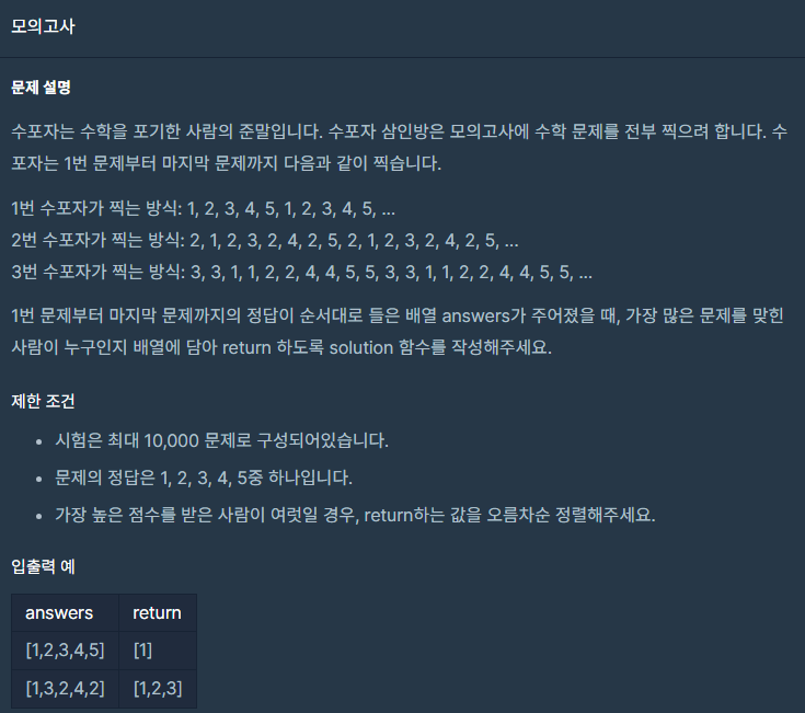 우선 각 규칙이 1, 2, 3번 수포자에게 나열되어 있다. 각 배열에 3가지의 규칙을 나열해 두고 점수를 저장할 정수형 배열 score와 list를 만들어줬다. 그 뒤 answers의 길이만큼 for문을 반복해 주고 만약 정답과 각 인덱스% 반복수의 값이 같으면 점수에 +1씩 해줬다. 그 뒤 정수형 변수 max에 최댓값을 넣어줬다. 다음 반복문에서는 score의 각 값들이 max값과 같다면 list에 추가해 줬다. (i+1)을 해준 이유는 0번부터 시작하는 게 아닌 1번부터 시작하기 때문에 +1을 해줬다. 그 뒤 answer을 list의 크기만큼 선언해 준 뒤 값을 그대로 answer에 대입하고 반환해 줬다.