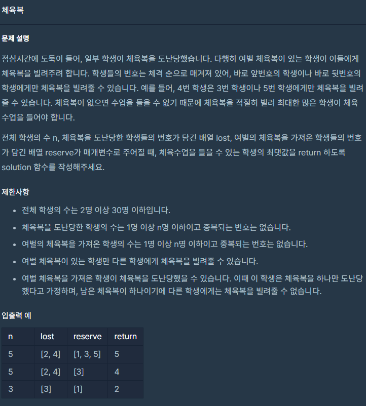 우선 reserve와 lost를 오름차순으로 정렬해 줬다. 초기 answer의 값은 전체학생수에서 체육복을 잃어버린 학생수를 빼준 만큼의 값을 초기화해 줬다. 그 뒤 중첩 for문을 사용해서 도난당한 학생 중 여벌의 체육복이 있는 학생을 구한다. i는 잃어버린 학생, j는 여벌의 체육복이 있는 학생만큼 반복했다. 내부에서는 잃어버린 학생의 번호와 여분의 체육복이 있는 학생의 값이 같으면 수업을 들을 수 있는 학생수인 answer을 1 더 해주고 lost, reserve값을 -1로 초기화해줬다. 그 다음 아래 for문은 체육복을 빌릴수있는 학생을 구하기 위해 사용했다. i는 잃어버린 학생, j는 여분의 체육복이 남아있는 학생이다. 조건을 걸어서 lost에서 -1한값과 +1한값이 reserve에 있는 값과 일치하다면 체육복을 빌려준것으로 판단하고 answer에 1을 추가해주고 reserve에는 -1을 초기화 해줬다. 그 뒤 answer을 반환하였다.