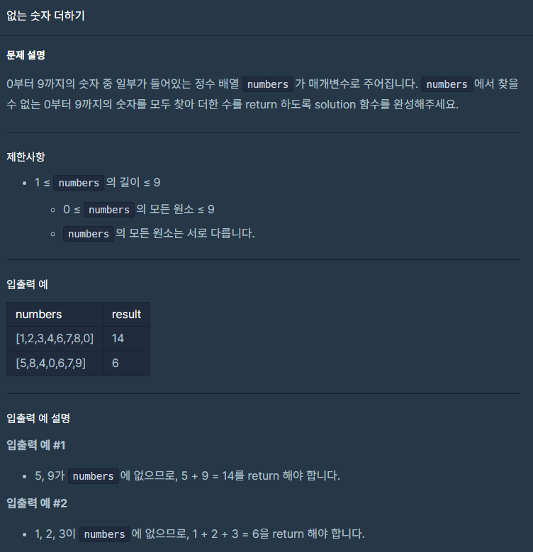 간단한 문제였다. 0~9까지는 한 번만 나오고 중복수는 없다고 했다. 따라서 총 0~9의 합을 구해줬다. 그 뒤 answer에 45를 저장하고 numbers를 반복문으로 돌리면서 값들을 45에서 빼주고 남은 answer의 값을 반환하였다.