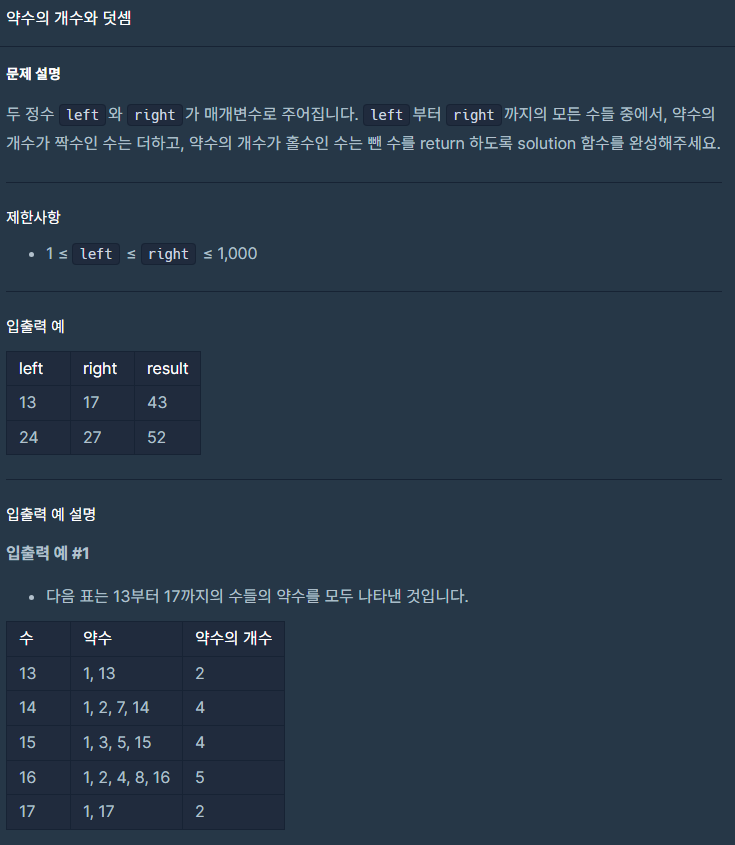 간단한 문제였다. 먼저 약수를 구하는 numsCnt를 하나 만들어주고 반복문을 시작했다. 반복문에서는 left부터 right까지 반복하였으며 num에 약수의 개수를 담아줬다. 그 뒤 약수의 개수가 짝수이면 answer에 i를 더해주고, 홀수이면 answer에 i를 빼줬다. 그 뒤 answer를 반환하였다.