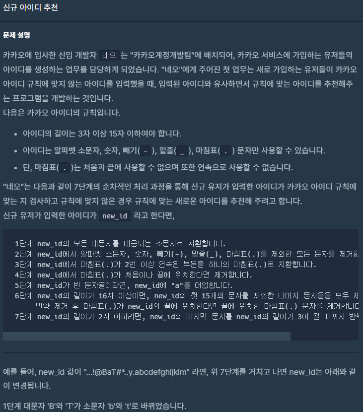 7단계는 new_id의 길이가 2자 이하라면, new_id의 마지막 문자를 new_id의 길이가 3이 될 때까지 반복해 주면 됐다. while문을 사용해서 step7의 길이가 2 이하라면 반복하게 했다. char형 변수 ch에 step7의 마지막 원소를 넣어주고, step7에 ch를 계속 더해줬다.