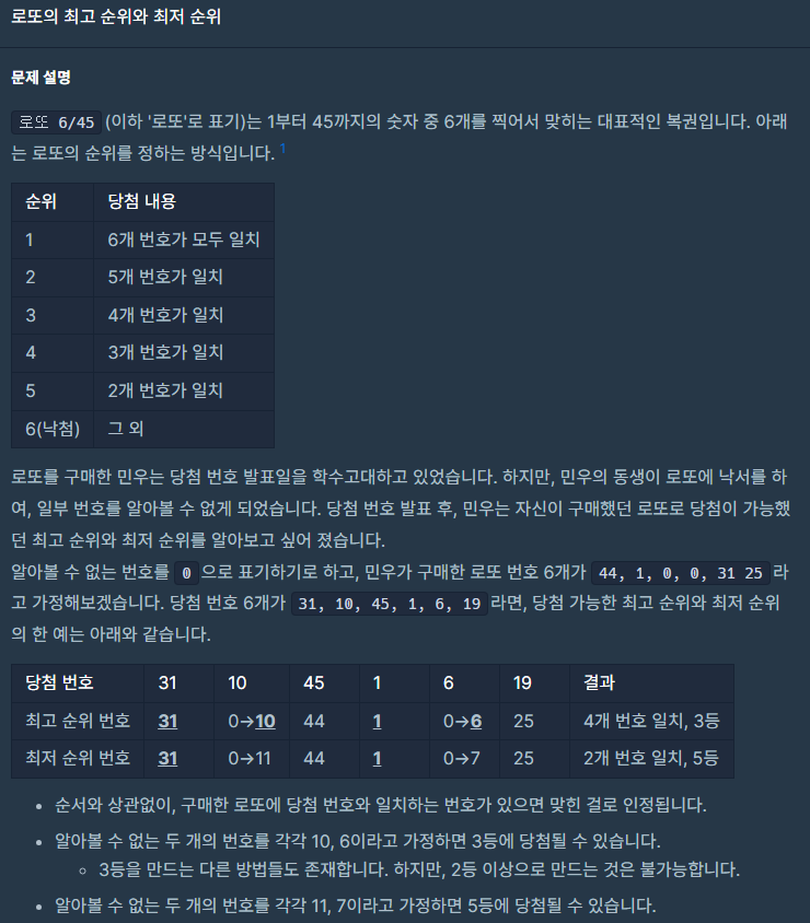 생각보다 간단한 문제였다. 먼저 최저를 구했다. lottos의 값과 win_nums의 값이 일치하는 게 있다면 정수형 변수 equals에 1을 더해주고 반복문을 종료하였다. 이렇게 하면 로또 번호가 일치하는 개수가 나온다. 7에서 맞춘 개수를 뺴주면 된다. 하지만 6등까지만 존재하니 0개를 맞췄을 때는 6등을 넣어준다. 0개가 아닐 때는 7에서 equals의 개수를 빼주고 answer [1]에 넣어줬다. 다음 최고를 구하는 방법은 기존 equals에 lottos의 수가 0인만큼 더해줬다. 그렇게 되면 0이 들어간 번호도 다 로또번호와 일치한다고 가정이 되며 최고의 경우가 나올 것이다. 이도 마찬가지로 equals이 0이라면 6등을 넣어주고, 아니라면 7에서 equals을 빼고 answer [0]에 넣어줬다. 그 뒤 answer을 반환하였다.
