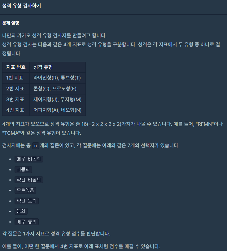 map 하나를 선언해 주고 시작했다. for문을 사용해서 survey의 크기만큼 반복해 주고 s를 공백 없이 잘라서 문자열 배열 s에 넣어줬다. 그렇게 되면 두 개로 나뉠 것이다. 그 뒤 num의 크기를 비교했다. 1~3이라면 s [0]의 점수에 더해줘야 한다. 따라서 4에서 점수만큼 빼준뒤 넣어줬다. 만약 4보다 크다면 s [1]의 점수에 더해줘야 하기 때문에 num에서 4를 빼서 넣어줬다. 이렇게 되면 모르겠음을 제외하고 점수가 들어간다. 그 뒤 RT, CF, JM, AN을 각각 비교해 줬다. map에서 값을 꺼내왔다. 만약 값이 없다면 0을 기본값으로 잡아줬다. 그 뒤 큰 값을 answer에 더해주고 answer을 반환하였다.