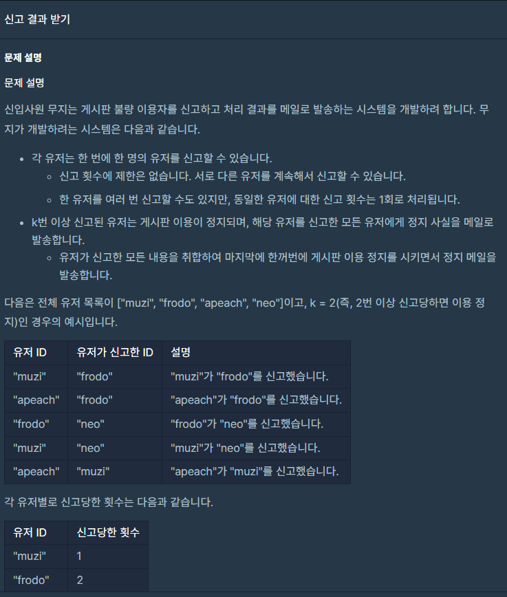 생각할게 많은 문제였다. 우선 map을 두 개 만들었다. map, map2가 있는데 map은 사용자 ID를 키로 가지고 해당 사용자가 신고한 유저들을 담도록 했고, map2는 사용자의 ID를 키로가 지고 해당 사용자의 인덱스를 값으로 가지도록 했다. 첫 번째 for문에서는 ID리스트의 길이만큼 반복하였고 문자열 변수 id에 문자열을 넣어준 뒤 map에는 id와 빈 HashSet을 넣어주고, map2에는 id와 인덱스번호를 넣어줬다. 그 뒤 forEach문에서는 report에 있는 문자열을 공백을 기준으로 나눴다. 나누면 두 개로 나눠지는데 첫 번째가 신고한 유저, 두 번째가 신고당한 유저 이렇게 저장될 것이다. 따라서 map에서 신고당한 유저의 값에 신고한 유저를 추가해 줬다. 이렇게 하면 map에서 key값으로 사용된 사용자가 자신을 신고한 사용자의 이름을 가지게 될 것이다. 그리고 마지막 for문에서는 ID리스트의 길이만큼 반복하게 하였고, map에서 각각의 값을 꺼내서 Set에 넣어줬다. 만약 크기가 k보다 크거나 같으면 forEach문을 사용해서 그에 맞는 인덱스값인 map2를 사용해 1씩 더해줬다. 그 뒤 answer을 반환하였다.