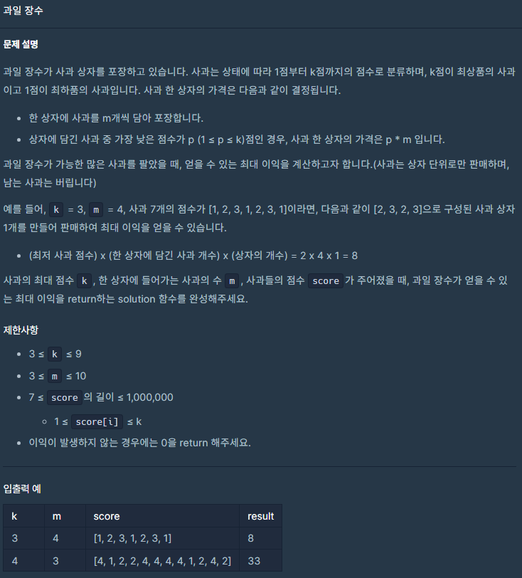 여러 방법을 사용하다가 이 풀이 방법까지 오는 데에 시간이 조금 걸렸다. 간단한 문제였다. score를 오름차순으로 정렬해 준 뒤 for문을 사용해서 i는 score의 길이부터 시작해 줬다. i는 m씩 빼줬다. 이유는 어차피 최저점을 곱해줘야 하기 때문에 최저점에 해당하는 인덱스 값만 구해서 그에 속한 점수를 얻어온 뒤 m을 곱해주면 됐다. 따라서 answer에는 score [i-m]의 값을 구해온 뒤 m을 곱한 값을 더해줬다. 그 뒤 answer을 반환하였다.