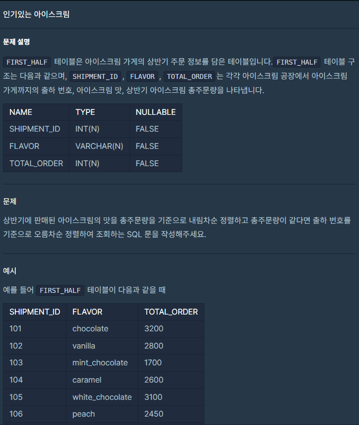 FIRST_HALF 테이블에서 FLAVOR칼럼을 조회했고 정렬은 TOTAL_ORDER를 기준으로 내림차순으로 하였다. 만약 해당 값이 같다면 SHIPMENT_ID를 기준으로 오름차순 정렬하였다.