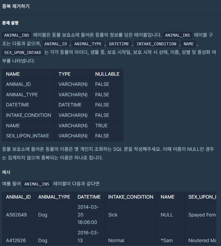 ANIMAL_INS 테이블에서 NAME을 조회했다. 이때 DISTINCT를 사용해서 중복되는 요소는 개수로 포함하지 않는다. 별칭은 count로 설정해 줬다. 조건은 NAME이 NULL값이 아닌 것들만 조회했다.