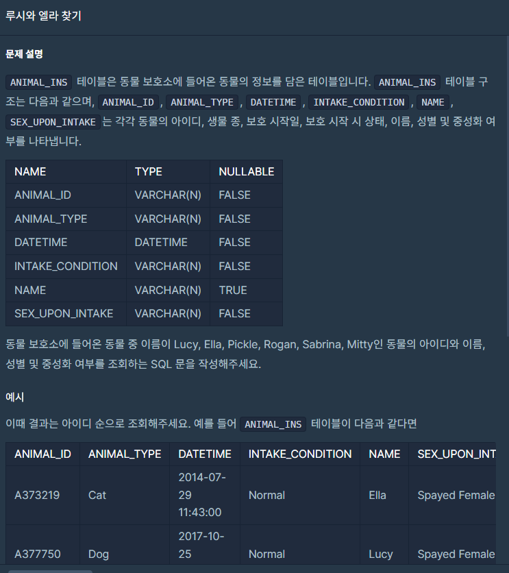 ANIMAL_INS 테이블에서 ANIMAL_ID, NAME, SEX_UPON_INTAKE컬럼을 조회했다. 조건은 NAME이 Lucy, Ella, Pickle, Rogan, Sabrina, Mitty 중 포함되는 것들만 조회해 왔다.