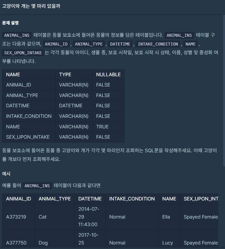 ANIMAL_INS 테이블에서 ANIMAL_TYPE과 개수를 조회하였다. 별칭은 count로 줬다. 그룹은 ANIMAL_TYPE으로 그룹핑해 주고 조건은 ANIMAL_TYPE이 cat, dog에 포함되는 것만 선택하였다. 그 뒤 정렬방식은 ANIMAL_TYPE을 기준으로 오름차순 정렬을 했다.