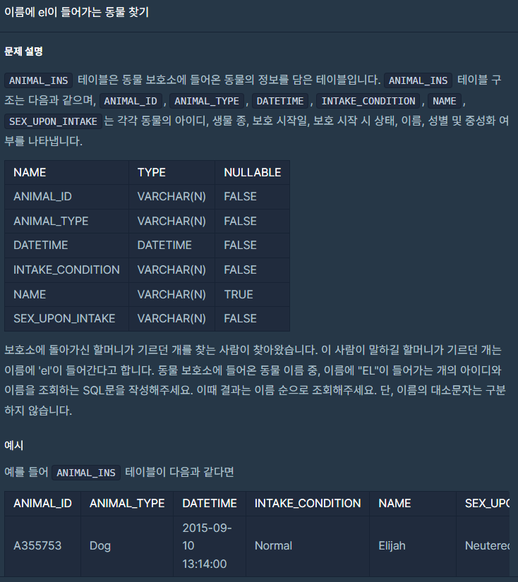 ANIMAL_INS 테이블에서 ANIMAL_ID, NAME 칼럼을 조회했다. 조건은 ANIMAL_TYPE이 Dog이고 NAME이 el이 포함되는 것들만 조회했다. 정렬은 NAME을 기준으로 오름차순 정렬을 해줬다.