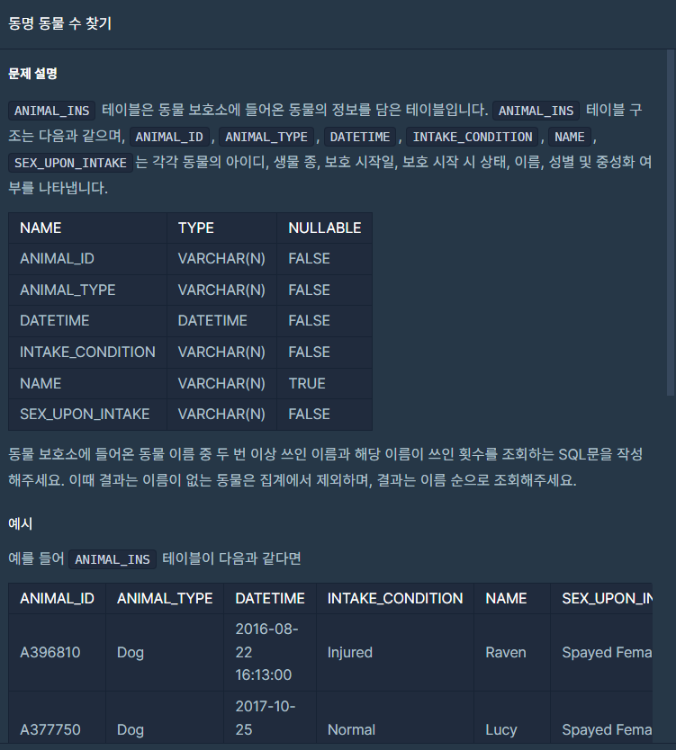 ANIMAL_INS 테이블에서 NAME과 개수를 조회 했다. 조건은 NAME이 NULL값이 아닌 것들을 조회했고, 그룹은 NAME으로 정해줬다. 그룹의 조건은 COUNT가 2 이상일 때로 정해줬다. 정렬은 NAME을 기준으로 오름차순 정렬을 해줬다.