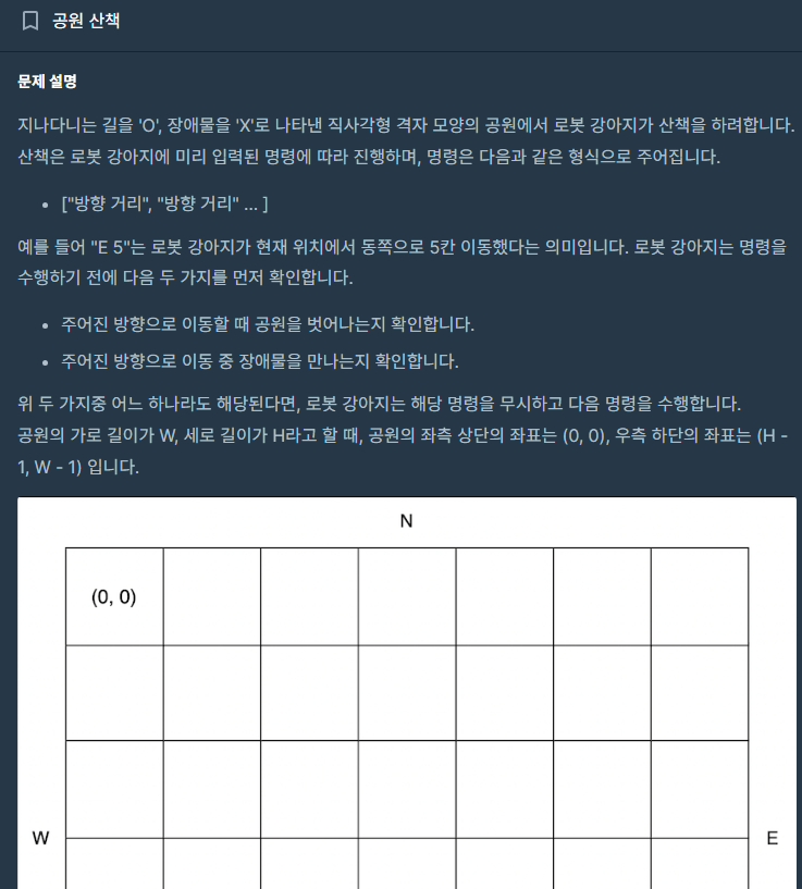 answer은 좌표를 작성해야 하니 길이를 2로 지정했다. 좌표값을 x, y로 선언하고 처음 for문에서 S가 들어간 배열위치를 찾아서 y값에 i를 넣어줬다. 그 뒤 x값에는 S가 있는 인덱스값을 넣어줬다. 두 번째 for문에서는 routes의 각 배열들을 공백기준으로 나눠줬다. 첫번째값은 문자를 비교하는데 사용할것이고 두번째값은 이동할 길이로 사용을 해줬다. 문제가 생기면 값을 이전값으로 되돌려야하기때문에 nx, ny변수를 생성해서 사용하였다. 두번째 for문안에 있는 for문에서는 i를 0부터 len까지 반복하도록 하였고 문자가 E면 x좌표+1, W면 x좌표-1, S면 y좌표+1, N이면 y좌표-1을 해줬다. 그리고 마지막에 nx가 0보다 작거나 공원 길이를 초과했을 때, ny가 0보다 작거나 공원길이를 초과했을때, 현재값이 X(이동 불가) 값인지 체크를 해줬다. 이 경우에는 nx, ny를 이전값인 x, y를 넣어주고 break를 사용해서 반복문을 종료시켰다. 그 뒤 x, y에 nx, ny값을 넣어줬다. 값을 구해준 뒤 answer에 y값, x값을 넣어주고 반환하였다.