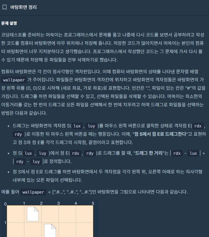 최솟값의 좌표와 최댓값의 좌표의 값으로 사용할 minX, minY, maxX, maxY를 선언했다. 그 뒤 min값들에는 가장 높은 값을 넣어주고, max값들에게는 가장 낮은 값을 초기화해 줬다. 그 뒤 for문을 사용해서 wallpaper안의 모든 값을 비교하도록 했고, wallpaper배열 안의 문자가 #일 때 실행하도록 했다. minX는 minX와 i 중 낮은 값, minY는 minY와 j 중 낮은 값, maxX는 maxX와 i 중에 높은 값, maxY는 maxY와 j 중에 높은 값으로 지정했다. 그 뒤 answer에 4가지의 값을 넣어준 뒤 반환하면 된다. 맥스값에 +1씩 해준 이유는 끝점을 잡아야 하기 때문에 +1씩 해서 좌표를 올바르게 선언해 줬다.