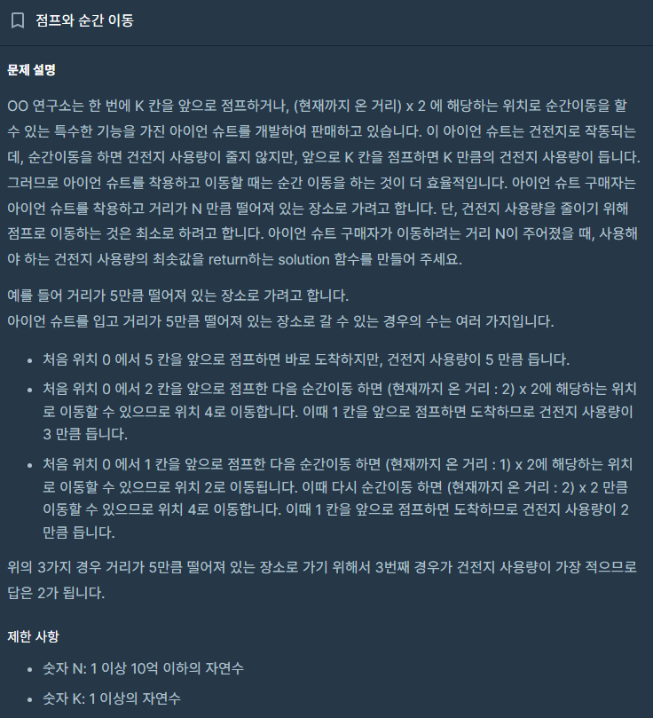 while의 실행조건을 n이 0보다 클때로 걸었다. 그 뒤 내부에서는 n이 2로 나눠 떨어질 수 있으면 n을 2로 나눈다. 만약 홀수라면 n에서 1일 빼주고 ans에는 1을 더해서 카운트를 올려준다. n이 0보다 작아질 때까지 반복한 뒤 ans를 반환해 주면 된다.