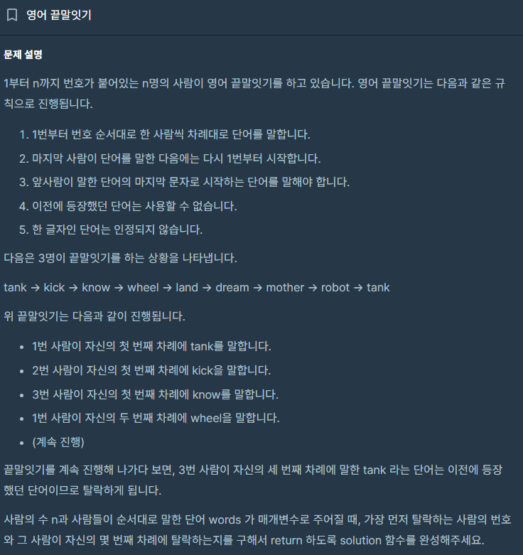 Map형식의 map변수 하나를 만들었다. 그 뒤 for문을 사용해서 words의 단어들을 확인했고 i가 0이 아닐 때는 str에는 현재 단어를 대입, before에는 이전의 단어를 대입해 줬다. 그 뒤 first에는 현재 단어의 첫 글자를 넣어주고, last에는 이전글자의 마지막번째 글자를 넣어줬다. 그 뒤 if문을 사용해서 map에 str를 키값으로 가지는 값이 있거나 first, last가 다른 값일시 answer에 각각 i% n+1, i/n+1을 해서 번호와 차례를 넣어줬다. 만약 여기에 걸리지 않는다면 map에 words [i]를 키로가 지는 값을 넣어주고 반복했다.