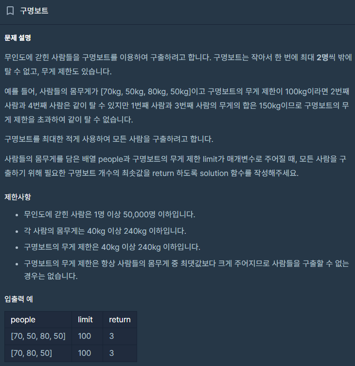 가장 가벼운 사람의 인덱스로 사용할 first와 가장 무거운 사람을 태울 인덱스로 사용할 last를 만들어줬다. 그 뒤 Arrays.sort를 사용해서 people을 오름차순으로 정렬해 줬다. 그 뒤 while문을 사용해서 last가 first보다 크거나 같을 때 반복하도록 했다. 내부에서는 if문을 사용해서 people의 first, last번째있는 값을 더해서 limit보다 작거나 같으면 태울 수 있으니 first를 1 증가시키고, 아니라면 last만 1을 빼주고 answer에는 보트하나를 더해준다. 이런 식으로 하게 되면 큰사람은 계속 탈 수 있고, 제일 작은 사람과 큰사람을 비교해 가며 두 명이 함께 탈 수 있을 때는 first +1, last -1이 동시에 이루어져 모든 사람을 태우면서 가장 조금 필요한 보트의 수를 구할 수 있을 것이다.