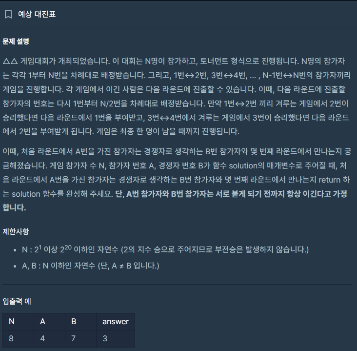 while문을 사용해서 a와 b가 같지 않으면 실행하도록 했다. a, b 각각 1을 더하고 2로 나눠줬다. 그 뒤 answer을 1 추가한다. 이렇게 해주면 홀수번호는 짝수로 변할 거고 짝수번호는 그대로 짝수로 나뉘게 된다. 이 값이 같아지면 만난다는 뜻이므로 answer을 카운트한 만큼이 답이 된다. n/2로 되기에 가능한 문제다.