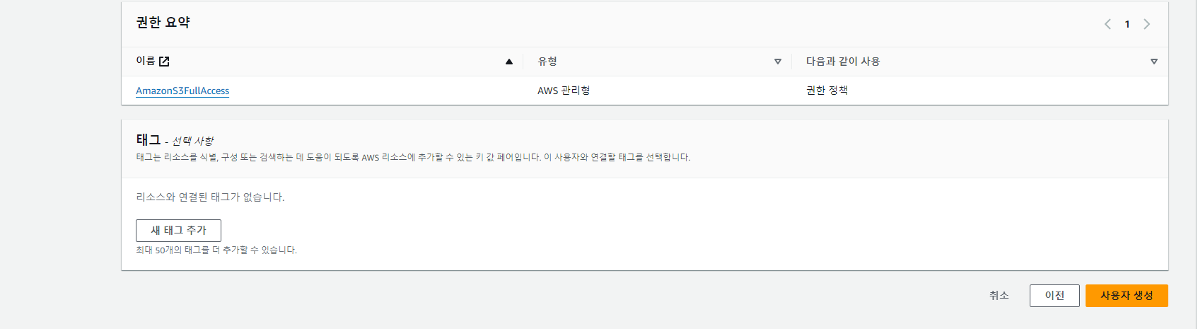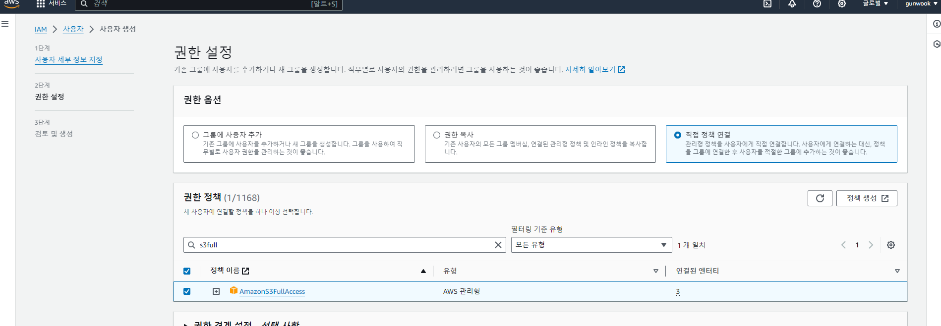 다음 버튼을 누르면 이 화면이 뜬다. 세 번째 직접 정책 연결 버튼을 누른 뒤, 검색 창에 s3 full을 쳐서 AmazonS3 FullAccess 버튼을 체크 후 [다음]으로 넘어간다.